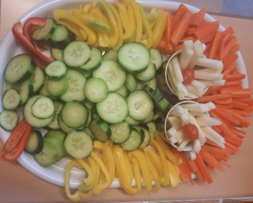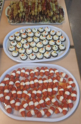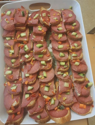 ein herrliches Büffet mit Obstspießen, belegten Pumpernickel, Wurst- und Käsebroten, Gemüsesticks, Eierbroten und vielem mehr. Die Zutaten, die von Läden aus der näheren Umgebung teilweise