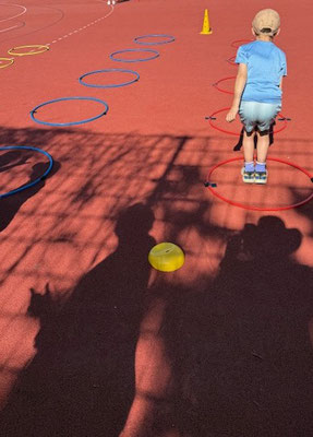 Es folgten verschiedene kleinere Einheiten zur Koordination mit und ohne Ball, sowie Prellen, Werfen, Fangen, Balancieren und Zielen. Aufgebaut waren diese Übungen wie eine Art Zirkeltraining.