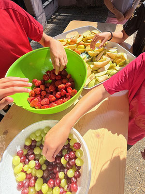 Nach viel Schweißarbeit wartete eine leckere Überraschung auf alle. Denn der Förderverein hatte für jede Klasse einen Obsttisch mit Erdbeeren, Trauben, Äpfeln und Birnen vorbereitet. Das Obst ließen sich alle Kinder schmecken und genossen es, so oft zugreifen zu dürfen wie sie wollten.