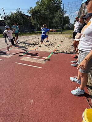 Alle Klassen trafen sich um 8.30 Uhr auf dem Sportplatz. Die Stimmung und die Motivation waren noch höher als die sommerlichen Temperaturen und so starteten wir pünktlich mit einem Tanz, dessen Choreografie gezeigt und dann von allen Kindern nachgetanzt wurde. Danach startete jede Klasse an ihrer ersten Station. Aufgrund eines hervorragend ausgearbeiteten Plans lief der Wechsel der Stationen reibungslos ab. Die Klassen 3 und 4 absolvierten andere Stationen als die Klassen 1 und 2. Auf diese Weise werden die jüngeren Klassen auf die Herausforderungen vorbereitet und können es kaum erwarten, bis auch sie -wie die Großen- in die Sprunggrube springen dürfen.
